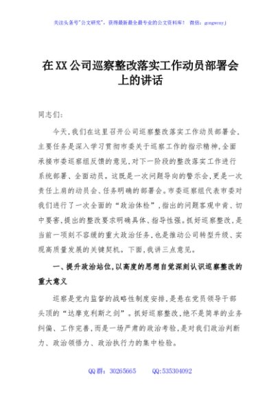 / 在XX公司巡察整改落实工作动员部署会上的讲话