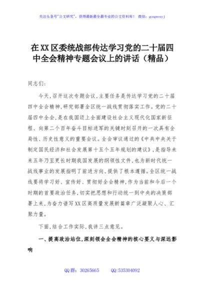 / 在XX区委统战部传达学习党的二十届四中全会精神专题会议上的讲话(精品)