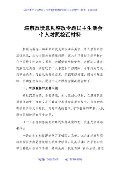 / 巡察反馈意见整改专题民主生活会个人对照检查材料