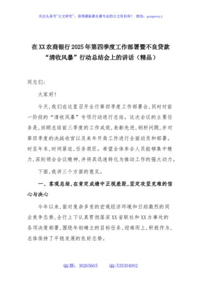 / 在XX农商银行2025年第四季度工作部署暨不良贷款“清收风暴”行动总结会上的讲话(精品)