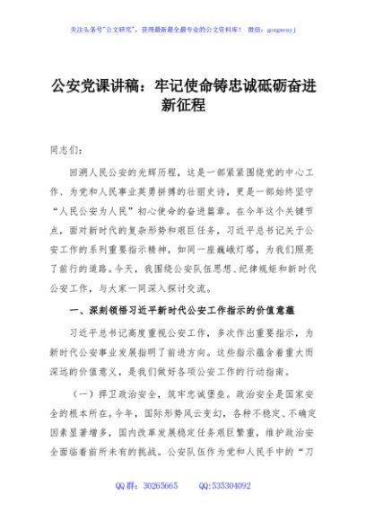 / 公安党课讲稿:牢记使命铸忠诚砥砺奋进新征程