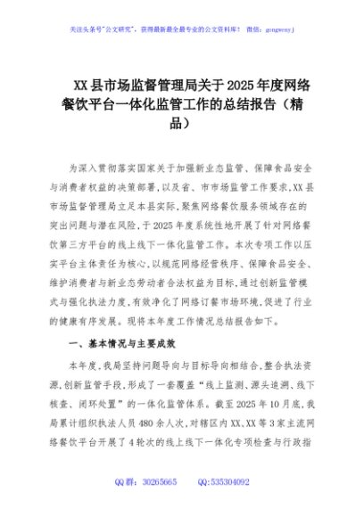 / XX县市场监督管理局关于2025年度网络餐饮平台一体化监管工作的总结报告(精品)