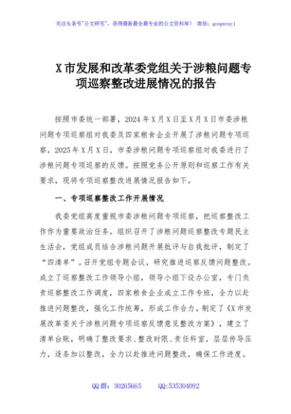 / X市发展和改革委党组关于涉粮问题专项巡察整改进展情况的报告