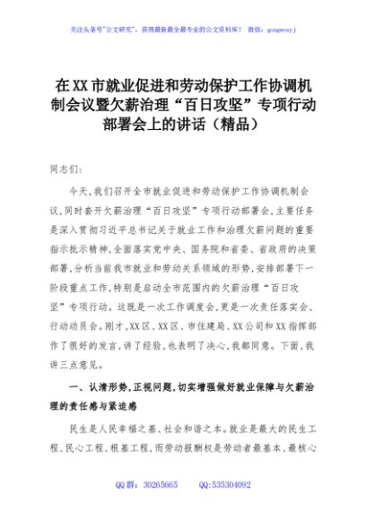 / 在XX市就业促进和劳动保护工作协调机制会议暨欠薪治理“百日攻坚”专项行动部署会上的讲话(精品)