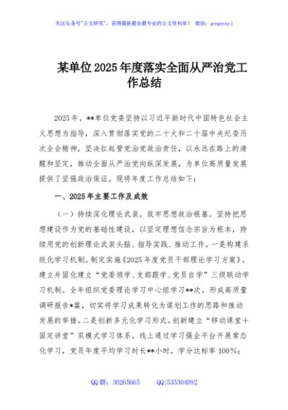 / 某单位2025年度落实全面从严治党工作总结