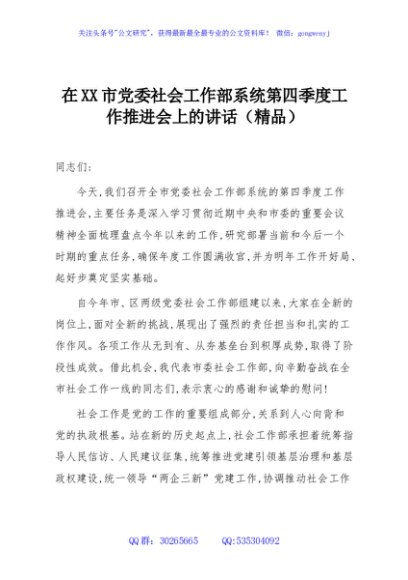 / 在XX市党委社会工作部系统第四季度工作推进会上的讲话(精品)