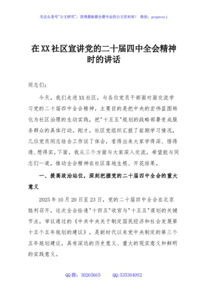 / 在XX社区宣讲党的二十届四中全会精神时的讲话
