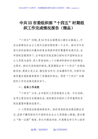 / 中共XX市委组织部“十四五”时期组织工作完成情况报告(精品)