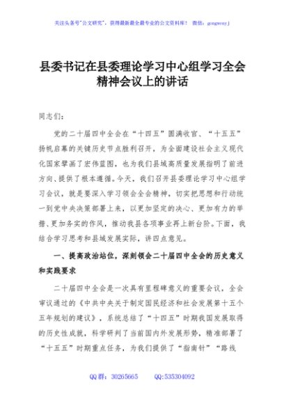 / 县委书记在县委理论学习中心组学习全会精神会议上的讲话