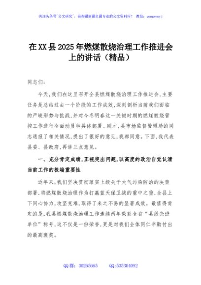 / 在XX县2025年燃煤散烧治理工作推进会上的讲话(精品)
