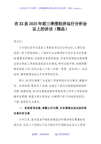 / 在XX县2025年前三季度经济运行分析会议上的讲话(精品)