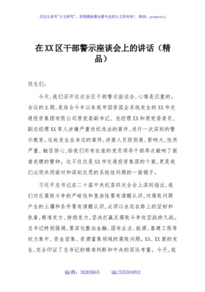 / 在XX区干部警示座谈会上的讲话(精品)