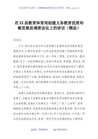 / 在XX县教育体育局创建义务教育优质均衡发展县调度会议上的讲话(精品)