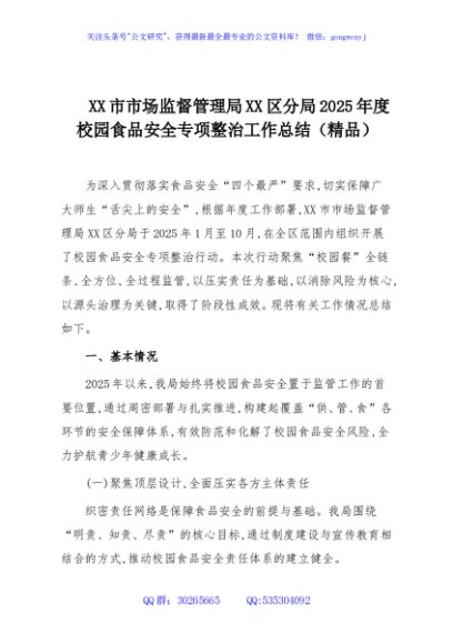 / XX市市场监督管理局XX区分局2025年度校园食品安全专项整治工作总结(精品)