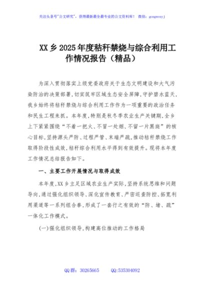 / XX乡2025年度秸秆禁烧与综合利用工作情况报告(精品)