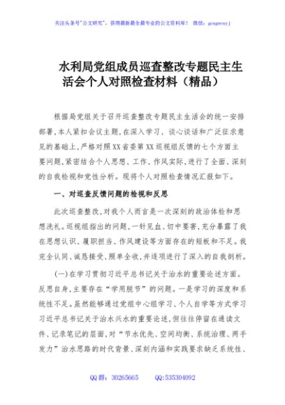 / 水利局党组成员巡查整改专题民主生活会个人对照检查材料(精品)