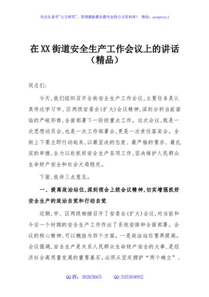 / 在XX街道安全生产工作会议上的讲话(精品)