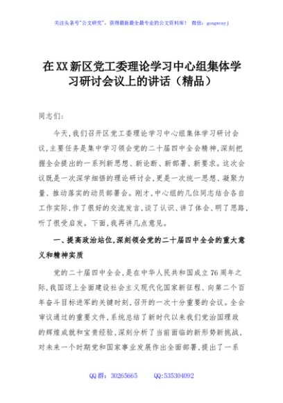 / 在XX新区党工委理论学习中心组集体学习研讨会议上的讲话(精品)
