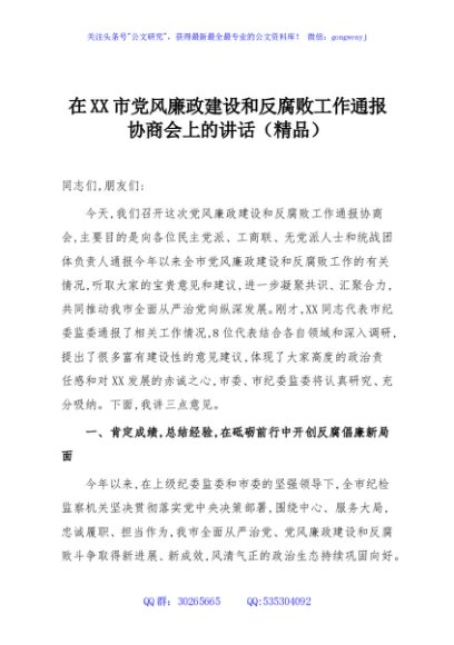 / 在XX市党风廉政建设和反腐败工作通报协商会上的讲话(精品)