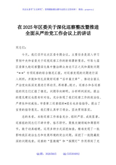 / 在2025年区委关于深化巡察整改暨推进全面从严治党工作会议上的讲话