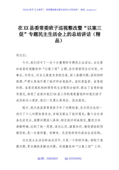 / 在XX县委常委班子巡视整改暨“以案三促”专题民主生活会上的总结讲话(精品)