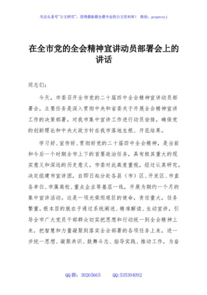 / 在全市党的全会精神宣讲动员部署会上的讲话