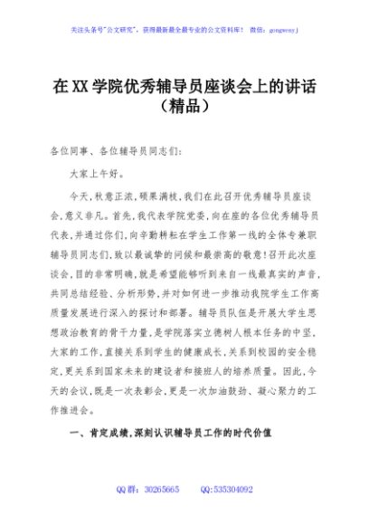 / 在XX学院优秀辅导员座谈会上的讲话(精品)