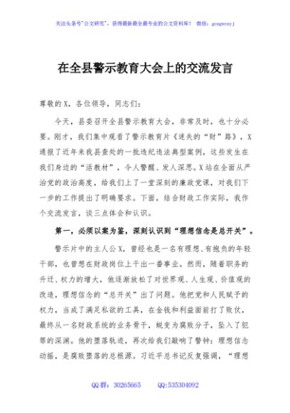 / 在全县警示教育大会上的交流发言
