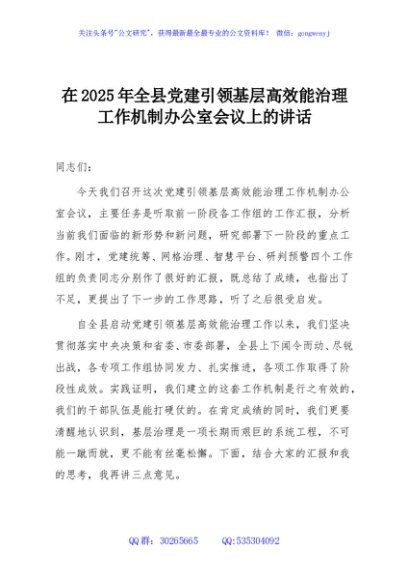 / 在2025年全县党建引领基层高效能治理工作机制办公室会议上的讲话