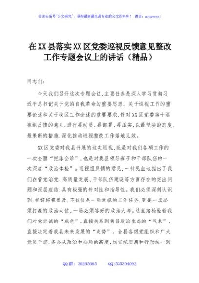 / 在XX县落实XX区党委巡视反馈意见整改工作专题会议上的讲话(精品)