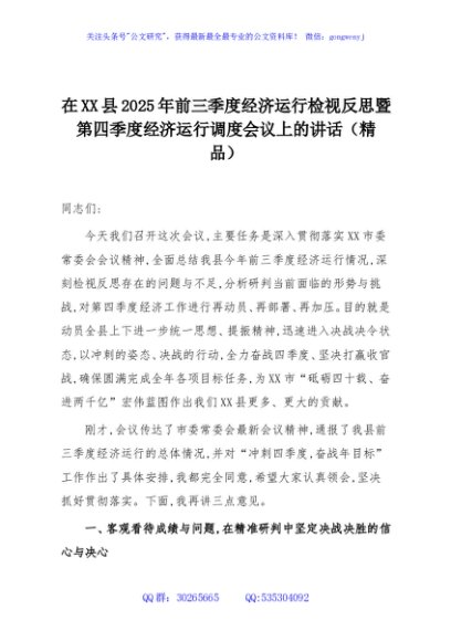/ 在XX县2025年前三季度经济运行检视反思暨第四季度经济运行调度会议上的讲话(精品)