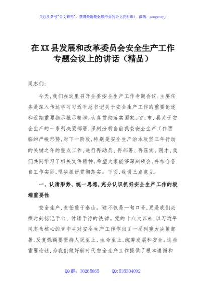 / 在XX县发展和改革委员会安全生产工作专题会议上的讲话(精品)