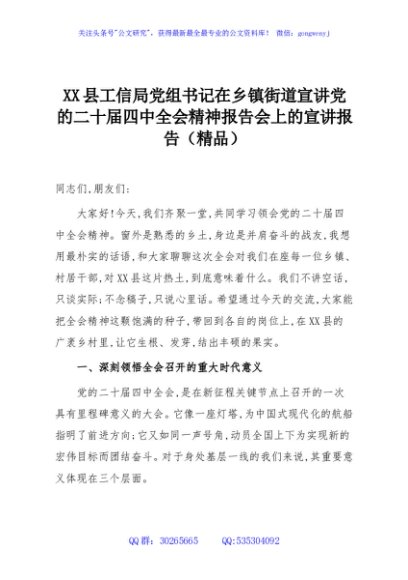/ XX县工信局党组书记在乡镇街道宣讲党的二十届四中全会精神报告会上的宣讲报告(精品)