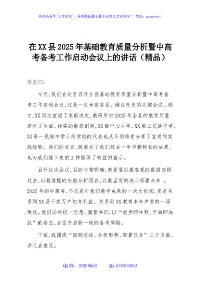 / 在XX县2025年基础教育质量分析暨中高考备考工作启动会议上的讲话(精品)