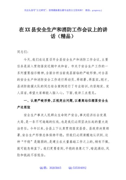 / 在XX县安全生产和消防工作会议上的讲话(精品)