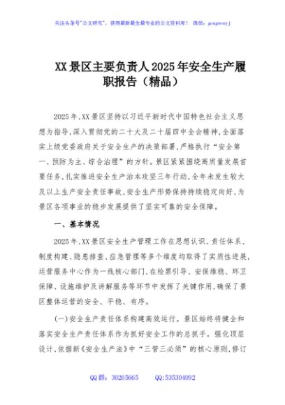 / XX景区主要负责人2025年安全生产履职报告(精品)