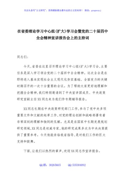 / 在省委理论学习中心组(扩大)学习会暨党的二十届四中全会精神宣讲报告会上的主持词