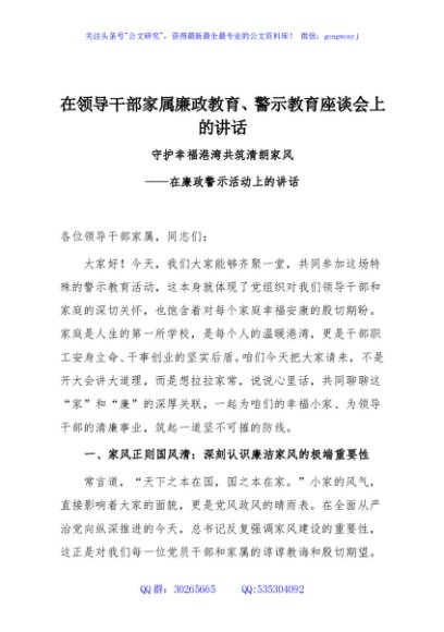 / 在领导干部家属廉政教育、警示教育座谈会上的讲话