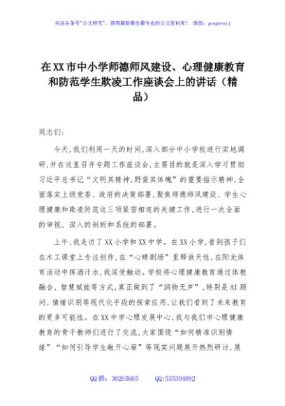/ 在XX市中小学师德师风建设、心理健康教育和防范学生欺凌工作座谈会上的讲话(精品)