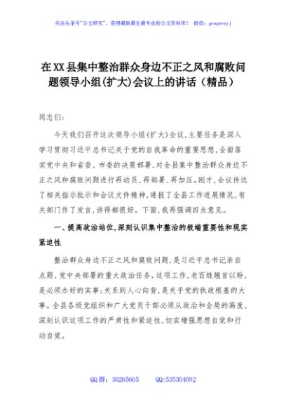 / 在XX县集中整治群众身边不正之风和腐败问题领导小组(扩大)会议上的讲话(精品)