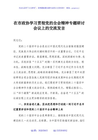 / 在市政协学习贯彻党的全会精神专题研讨会议上的交流发言