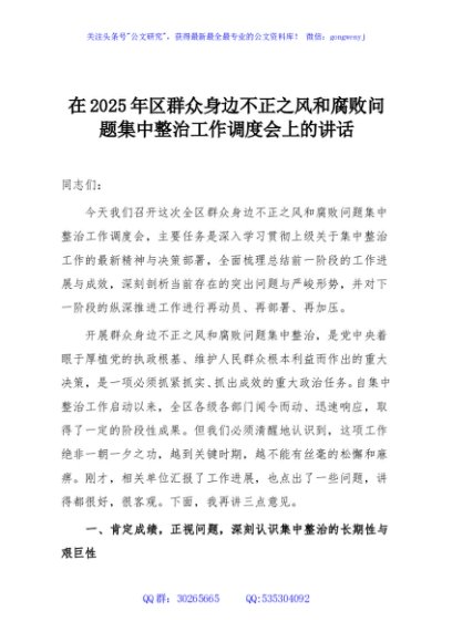 / 在2025年区群众身边不正之风和腐败问题集中整治工作调度会上的讲话
