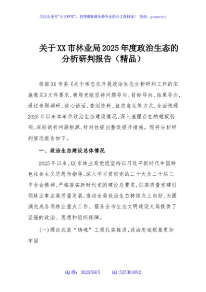 / 关于XX市林业局2025年度政治生态的分析研判报告(精品)