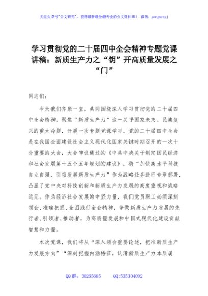 / 学习贯彻党的二十届四中全会精神专题党课讲稿:新质生产力之“钥”开高质量发展之“门”