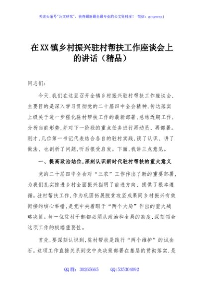 / 在XX镇乡村振兴驻村帮扶工作座谈会上的讲话(精品)
