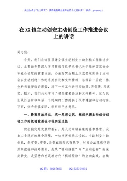 / 在XX镇主动创安主动创稳工作推进会议上的讲话
