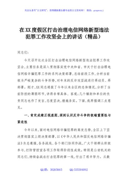 / 在XX度假区打击治理电信网络新型违法犯罪工作攻坚会上的讲话(精品)