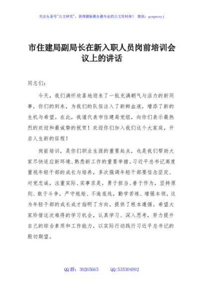 / 市住建局副局长在新入职人员岗前培训会议上的讲话