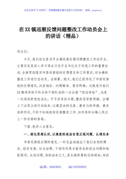 / 在XX镇巡察反馈问题整改工作动员会上的讲话(精品)