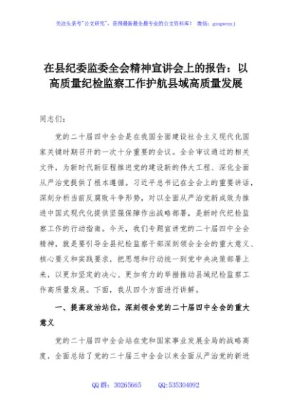 / 在县纪委监委全会精神宣讲会上的报告:以高质量纪检监察工作护航县域高质量发展